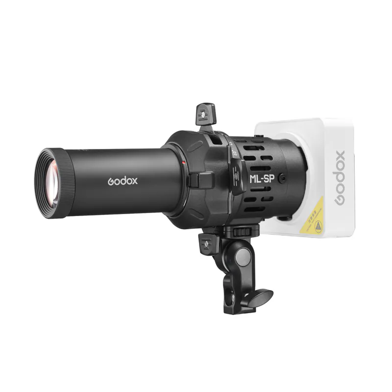 The Godox ML-SP19 Spotlight Projection Attachment is designed for use with the Godox ML60II Bi, ML100Bi, and ML100R compact LED Light fixtures. Providing creators with a powerful tool for producing creative and cinematic lighting effects, adding mood and depth to projects. Featuring interchangeable lens optics designed with sheer precision, ensuring super-crisp Projections with little to no aberrations. Use in conjunction with Coloured Gels ( available separately ) and a set of six Gobos, the possibilities unlimited.